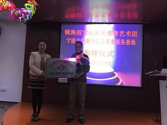 近日,我院与镇海招宝山阳光慈善艺术团共建的青年志愿服务基地揭牌仪式在镇海社会组织公益服务中心顺利举行。学工办主任董璐、阳光慈善艺术团团长张海江为志愿服务基地揭牌。