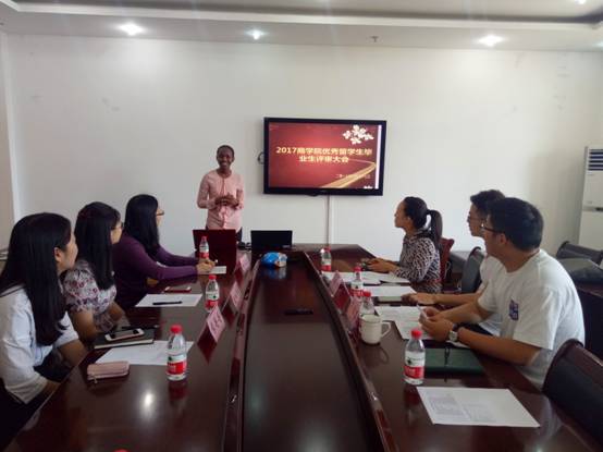5月27日,我院2017届优秀留学生毕业生评审会在学院412会议室顺利举行。学工办主任董璐,辅导员毛跃祖、蒋鹏涛,班主任张亚越等代表参加了此次评审会。经学生自助申请,班主任推荐,共有十三名优秀留学生毕业生代表进入评审会答辩环节。