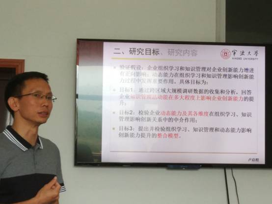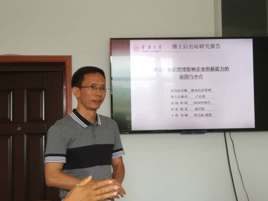 2017年9月24日上午10点,宁波大学渔业经济与管理博士后流动站卢启程博士后出站报告研讨会在11号楼103-2会议室举行。报告主题为“知识管理影响企业创新能力的前因与中介”,报告会由教育部特聘教授钟昌标教授主持,邀请了中国人民大学等校专家参与研讨,电竞博彩 20余名老师和研究生参加了此次活动。