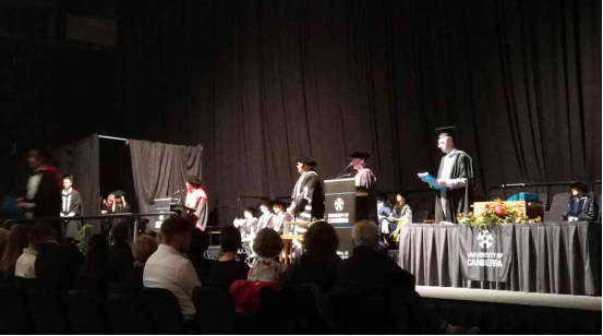 毕业典礼于上午10点30分准时开始。可容纳上万人的堪培拉体育中心现场人头济济,上千名毕业生与家人朋友在现场参加毕业仪式。校长H. Deep Saini教授首先发表了热情洋溢的欢迎致辞,祝贺全体学员顺利毕业,成为堪培拉大学又一届校友精英。紧接着,名誉校长Tom Calma Ao也发表讲话,代表堪培拉大学向毕业生和他们的家人们表示祝贺,恭喜他们迄今为止的努力与所取得的成绩,也祝愿他们接下去能够走得更高更远。