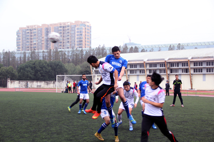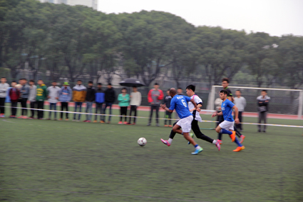 下午3点,激动人心的冠军争夺赛正式开始。足球场上人山人海,来自各个学院的中国学生与留学生们从四面八方赶来,带着满腔热情,支持自己的球队。率先开球的13运训队,紧锣密鼓的进攻和驾轻就熟的配合让人猝不及防。他们抓住一次空档,趁着中国队后卫来不及防御,突出重围将球带入球门前,前锋使劲一击,只见球以迅雷不及掩耳盗铃之势飞入球门。面对强悍而富有经验的对手,以及一分之差的落后比分,宁大校队不慌不忙,继续沉着应战。在一次次的进攻失败后,SPIDIO队终于凭借默契的团队合作,将勇猛的对手成功离散,以一记惊险的射球将比分扳成1比1。就在比分刚刚扳平不久,一声犀利的哨响将比赛带入尾声。