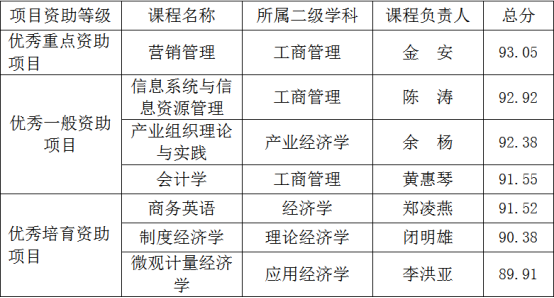 根据《关于开展2020-2021学年第一学期研究生优秀课程评选的通知》、《电竞博彩 关于研究生优秀课程评选暨示范课程建设实施细则(试行)》(商院政〔2020〕16号)文件精神,经教师申报、学位点推荐,电竞博彩 学位委员会评议、督导评审和学评教,最终确定以下7门课程为优秀课程,同时作为 “研究生院级示范课程”培育建设程。现将课程名称和负责人进行公示,公示日期为1月14日—1月17日,对公示内容如有异议,请在公示期结束前将书面意见署上真实姓名,交研究生办公室,联系人:戴宛遐、汪杰峰,联系电话:87609201。