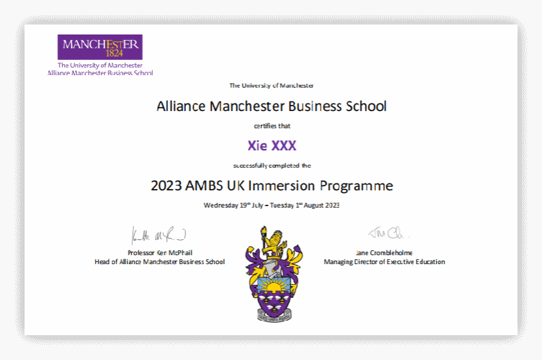 可获得曼切斯特大学电竞博彩 提供的官方成绩单与项目证书,表现优异的学生更有机会获得来自曼大电竞博彩 教授撰写的推荐信,高含金量的证明将助力学生未来的学业及职业发展。