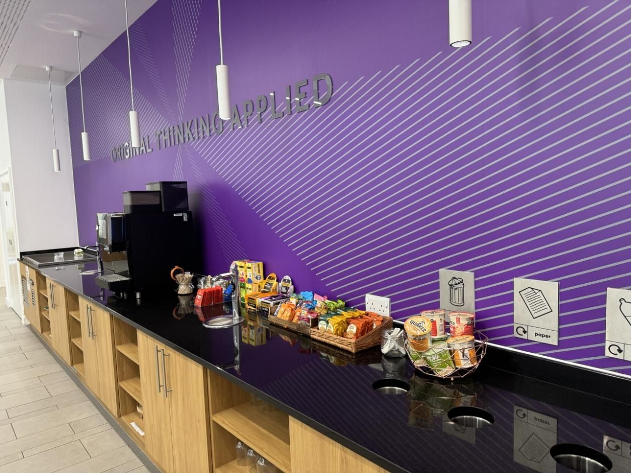 图为曼大电竞博彩 第一天注册材料,舒适的教学环境,教室外每日提供免费自助的水果、咖啡、茶、小食等供学生选择。